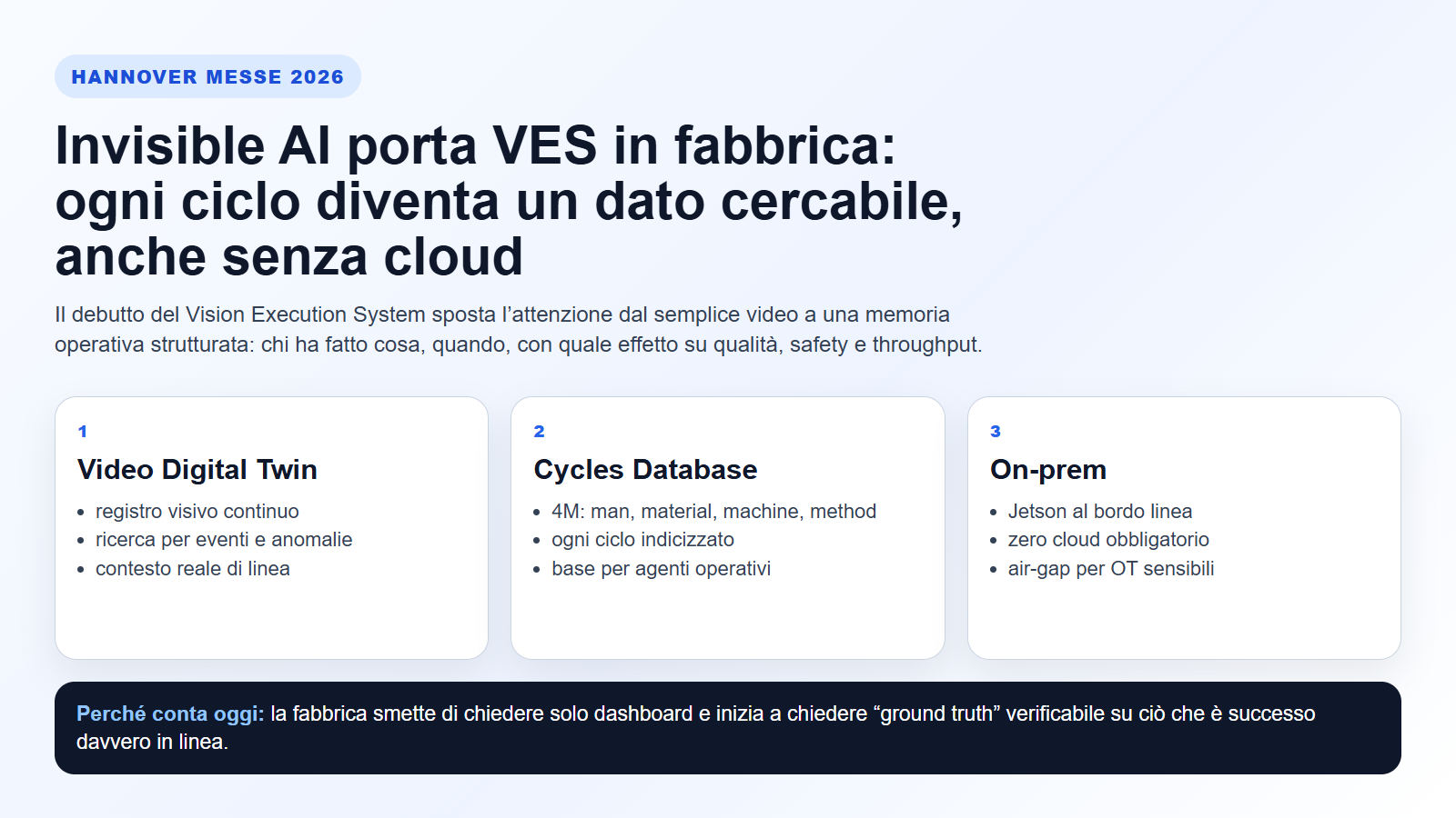 Invisible AI porta a Hannover Messe 2026 una notizia che vale più della singola demo: ogni ciclo produttivo può diventare un oggetto cercabile, analizzabile e discutibile tra operations, qualità e engineering. Se questa promessa si consoliderà, la differenza non sarà “più video”, ma più verità operativa disponibile quando serve davvero.