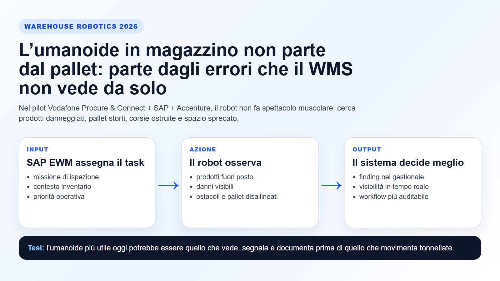 Se pensiamo a un umanoide in magazzino, l’immaginazione va subito al robot che prende scatole, sposta pallet o corre al posto degli operatori. Il pilot annunciato da Accenture, insieme a Vodafone Procure & Connect e SAP, racconta invece una storia più interessante e molto più credibile: l’umanoide parte dalle ispezioni visive e dalla capacità di chiudere il giro dentro un sistema gestionale vero.